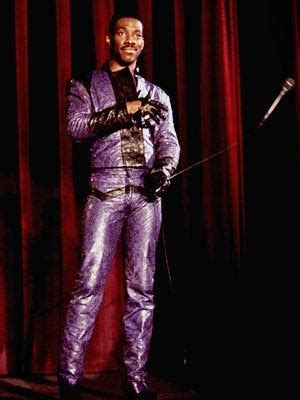 Eddie Murphy does a fair amount of posing himself. Like Dice, he revels in the atmosphere of male glamor, strutting across the stage, dressed in a leather suit and black gloves that compliment his figure and swagger. Murphy, like Dice, also grabs his genitals and brags about his sexual prowess, occasioning material that conveniently affords him the opportunity to do so. Like Dice, he’s also pitched at the level of rock stardom, and both films rely on that as a model. Like Dice, Murphy is also not bashful about his high-profile status and his bumping up against celebrities in the Hollywood climate.